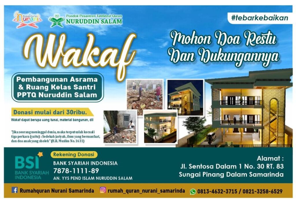 Wakaf ini merupakan panggilan kepada sahabat dan donatur untuk berpartisipasi dalam memajukan pendidikan agama di Indonesia, khususnya di PPTQ Nuruddin Salam. Dengan berwakaf, Anda ikut membantu menciptakan lingkungan yang kondusif bagi para santri dalam meniti perjalanan mereka menjadi penghafal Al-Qur’an. Amal jariyah dari wakaf ini akan terus mengalir pahala, mengikuti ajaran Nabi yang mengatakan: “Ketika anak Adam mati, maka terputuslah amalnya kecuali tiga perkara yaitu sedekah jariyah, ilmu yang bermanfaat, dan anak saleh yang mendoakannya.” (HR. Muslim). Mari bersama-sama meraih pahala jariyah dengan berwakaf untuk pembangunan Pondok Pesantren Nuruddin Salam dan membawa manfaat yang langgeng bagi pendidikan agama di masa depan.